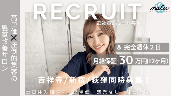 月給35万円スタート★幅広いデザインカラーと髪質改善が得意な店で働きませんか♪