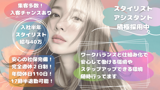 17時台退勤◎/週休2日で休み充実/サポート充実◎美容師を楽しむサロン