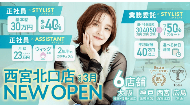 ■ 本当にお客様に入れるの? Totiaでは、多くのお客様と向き合ってほしいという想いから、月2000人以上の集客を実現しています。 入社、デビュー後も入客チャンスが豊富で、ゼロから指名100人を超えたスタイリストも多数在籍。 しっかり活躍できる環境が整っています。 ■ プライベートの時間、ちゃんと取れる? Totiaは、ライフスタイルに合わせた働き方を大切にしています。 土日に家族の予定やライブがあれば、もちろんお休みOK。 無駄な残業や意味のない拘束もなく、オフの時間を楽しめるのがTotiaの当たり前。 イベントごとも自由参加で、気負わず楽しめます。 ■ 働く空間や設備も気になる… 全席にTV・タブレット・充電器を完備。シャンプー台はフルフラットで快適。 一流の商材と最新設備を揃えた、トレンド発信型の空間で、お客様にもスタッフにも心地よいサロンを目指しています。 ■ 夢はあるけど、この先が不安… Totiaには、幹部登用制度や多様なキャリアの道があり、未来を一緒に描ける環境があります。 「やりたいこと」「目指したい姿」、まずはあなたの夢を聞かせてください。 その実現を、Totiaがサポートします。 Totiaは、美容師としての成長も、プライベートの充実も、どちらも大切にしたい人にぴったりのサロンです。 まずは、ぜひサロン見学でTotiaの空気感を感じてみてください。 あなたにお会いできる日を楽しみにしています!