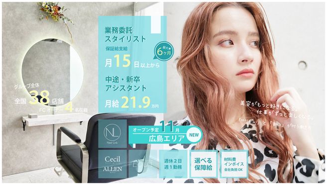 ― 積極採用エリア ― 大阪、京都、沖縄、兵庫、北海道 ― 2026年 NEW OPEN ― ALLEN ECLAT 広島店、ALLEN hair 阪神尼崎店 ◆他のサロンとはここが違う◆ ①集客力=高収入 【入店初月で月150名実績・即日入客可能】 ②業務委託・正社員を選べる 【いつでも変更可。ライフスタイルに合わせた働き方を】 ③有給・産休取得実績 【取得実績があるから安心・店長もスタッフも消化しています】 ④責任者常駐 【全店に店長がいるから安心の営業体制】 ⑤研修制度が充実 【不安な技術は勉強会で教えてもらえる】 顧客0でもご安心ください♪ 新規フリー客が毎月1000人以上♪ 新しいスタッフの方には新規フリー優先させていただきます♪ Next Linkでは、若手が活躍する美容室にしたい。 意欲ある美容師にチャンスを与えたい。 自らの腕でのし上がる土俵をつくりたい。 その気持ちをカタチにしてきました。 FCオーナーも次々輩出!(昨年実績2名) さぁ、次はあなたが活躍する時代です。 あなたの腕と、企業の力で。 一緒に目標を実現していきましょう♪ まずはご応募をお待ちしております!