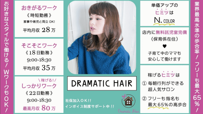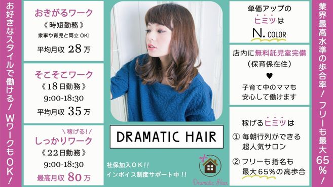 「予約の取りにくい人気サロン」として話題のビーエリアのセカンドラインです。お客様に大人気のN.カラーも、どこにも負けないプチプライス!開店前に行列ができる人気店です。年中無休だからお客様はいつでもご来店しやすく、働く方は定休日に縛られずに出勤していただけます。お客様も働く方もドラマチックにハッピーに!