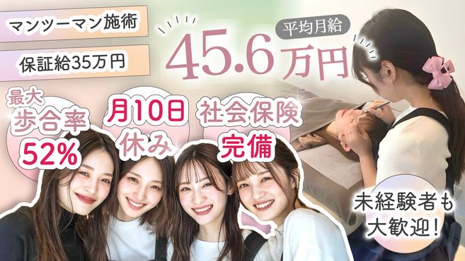 弊社は全国に50店舗以上のまつ毛サロンを展開。 日々満席が続く人気サロンのため、 より多くのお客様をご案内するために、新しい仲間を募集しています🌿 ▼〈おすすめポイント〉▼ ━━━━━━━━━━━━━━━━━ 🌸 業界トップクラスの給与体制 頑張りがしっかりお給料に反映される高歩合・高待遇! オープニング店舗でも 【最低保証給30万〜40万円】を保証◎ (入社後3〜6ヵ月) 【歩合率】業務委託の場合…[歩合率 最大52%✨] ▷売上45万円未満:45% ▷売上45万円以上:50% ▷売上50万円以上:51% ▷売上60万円以上:52% 💰給与例: *売上60万円 → 60万円×52%=月収31.2万円 *売上75万円 → 75万円×52%=月収39万円 *売上90万円 → 90万円×52%=月収46.8万円 ※売上ノルマは一切ありません! 🌸 しっかり休める環境 & 安心の待遇 *月10日休み (業務委託) *月8日休み (正社員) *土日休みOK/連休OK *誕生日月+1日お休み&バースデー手当あり *髪型・髪色・ネイル自由 仕事もプライベートもどちらも大切にできる環境です◎ 🌸 マンツーマン施術 カウンセリング重視のマンツーマン施術で お客様とじっくり向き合える環境✨ 希望に応じて掛け持ち施術もOK! 🌸 圧倒的な集客力 どの店舗も好立地&高リピート率✨ 長年の経験から培った弊社独自のノウハウで集客を行っており、SNSで大人気のサロンです◎ 🌸 安心の研修制度 研修センターにて、経験豊富な講師が一人ひとりに合わせて丁寧に指導✨ 未経験の方でも安心してデビューできる環境です。 研修期間中も給与を支給しており、安定した環境で技術を身につけられます◎