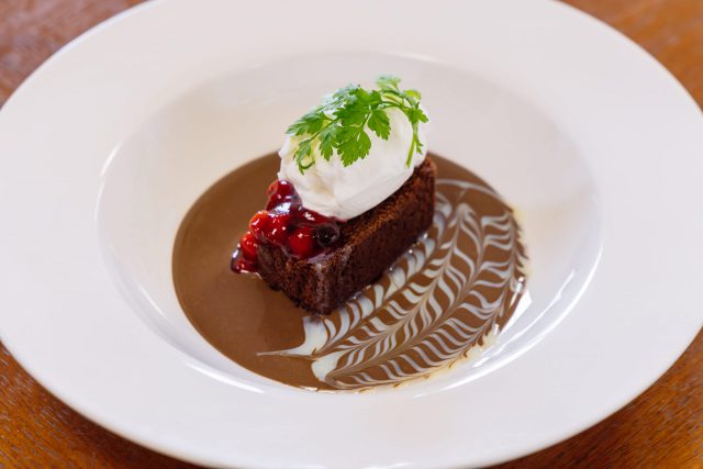 シェフズデイサービスという名の通り、ランチもおやつも味が自慢。この日のおやつはベリーソースのかかったチョコレートケーキ。