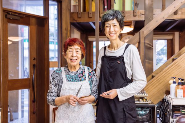 今でも店に立つ85歳のお母さまと。息子さんも理容師になり三代目が確定!