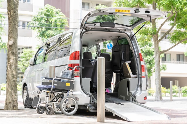 福祉タクシーでは、車いすに乗っている方に負担がかからないように、車いすに乗ったまま乗車できる福祉車両を使用します。一般的に福祉車両は、ワゴンタイプやボックスタイプが多く、車いす等の乗降をサポートする電動リフトやスロープが付いています。
