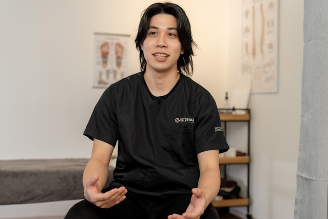 沖縄県出身。子どものころからサッカーに親しみ、「スポーツに携わる仕事がしたい」という思いからスポーツ整体・トレーナー学科のある専門学校へ進学。卒業後は整骨院に入社する。その後、脱毛サロン、産後整体サロンを経て、2025年1月に「KOTURIBA」へ転職。現在は麻布十番店の院長を務める。
