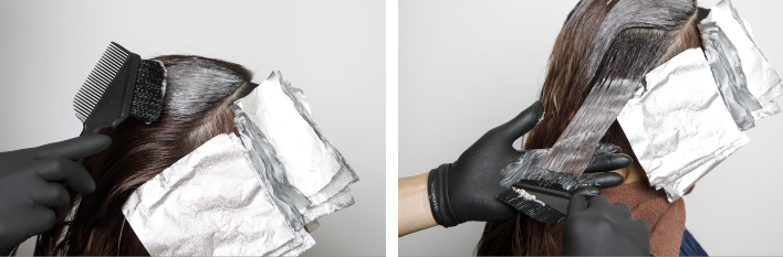 ベースカラー放置中、ブリーチ部分は様子を見てホイルを外す。ホワイト系カラーにする時は、しっかり色を抜くのがポイント。