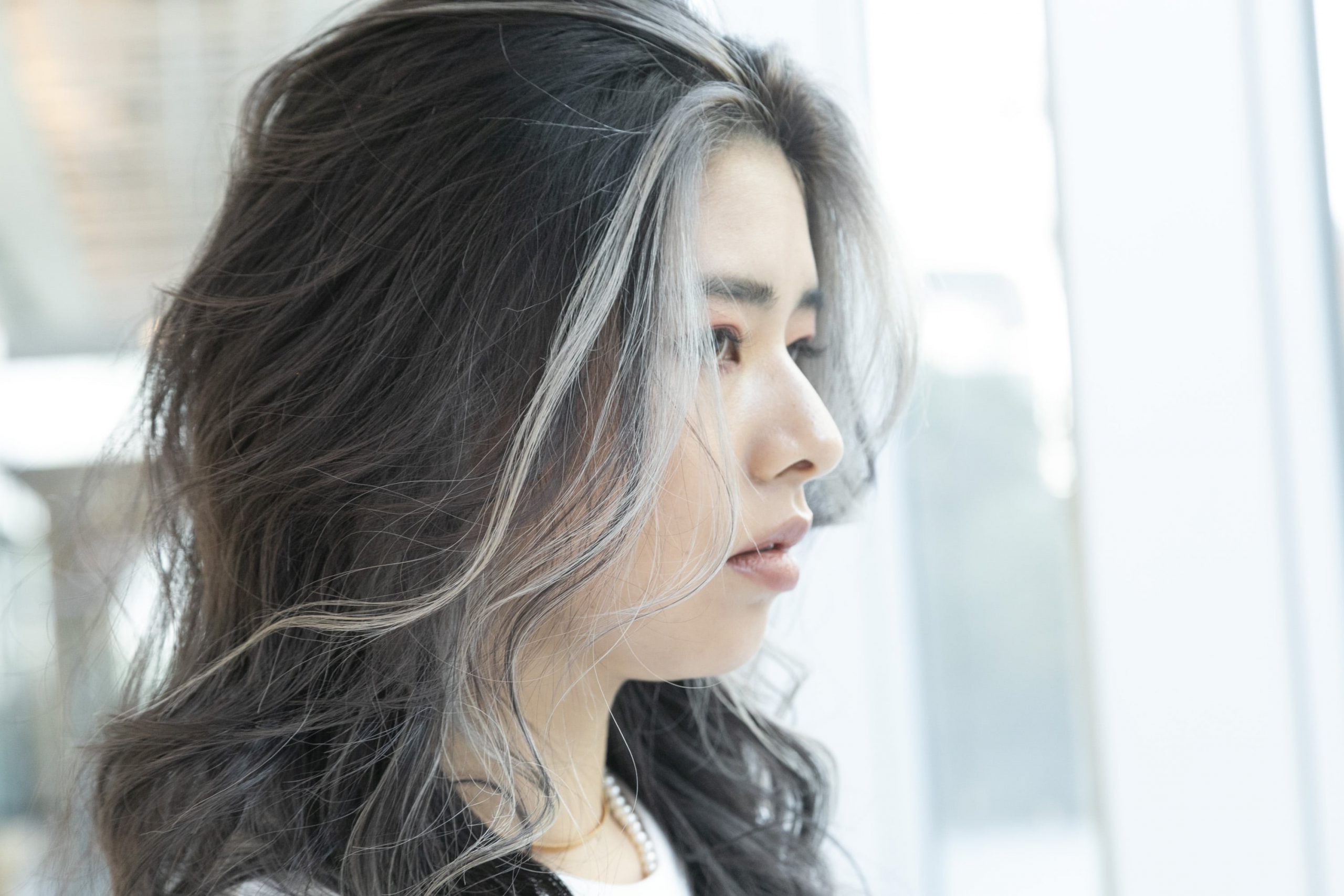 顔周りを囲うようにハイライトを施したデザインカラー。その人に合わせたハイライトのフレーム幅と、ベースカラーとフレームカラーの色選びがポイント。今回は、オーダー数も多いという、人気のホワイト系フレームカラーをピックアップ。ダークグレーのベースカラーと、ホワイトグレーのハイライトで、コントラスト強めのデザインに。