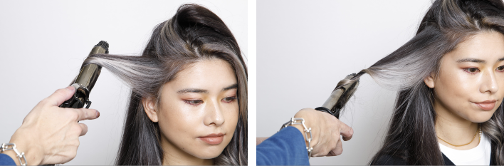 32mmのヘアアイロンで、全体をリバース巻きに。ざっくり毛束を取ってねじり、中間からヘアアイロンに巻きつけてカールをつけたら、一段下に滑らせて再度巻き込む。毛先まで繰り返す。