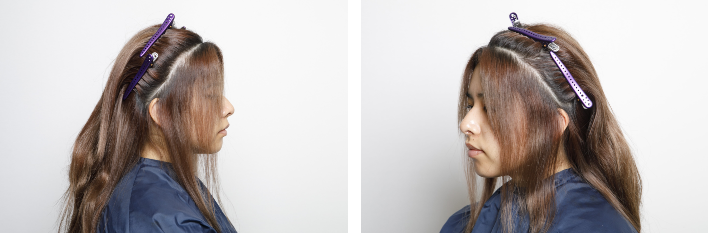 顔周りをブリーチ。スライスはできるだけ薄く取る。根元を少し開け、根元側にA、中間~毛先にBをたっぷり塗布。ダメージ状態によっては、毛先側は少し後から乗せて。ホイルは、折り目部分の色が抜けにくい場合があるので、折り過ぎないこと。