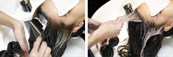 一度全体をシャンプー後、ブリーチ部分にケラスターゼ ブロンドアブソリュのシャンプーを塗布。少し置いたら、泡立ててシャンプー。紫の色味で、黄みが抑えられる効果が。