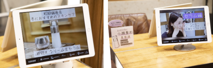スタッフたちがおすすめするアイテムの使っているシーンを見せたり、ポイントをレクチャーする。銀座店は全セット面にタブレットを設置しているので、そこで動画を流してお客様に気軽に見てもらう。お客様は動画を見て、「これ何ですか?」となって話やすくなるし、タブレットの近くにはおすすめのポップを貼ることでさらに購入のきっかけに。動線作りですよね。