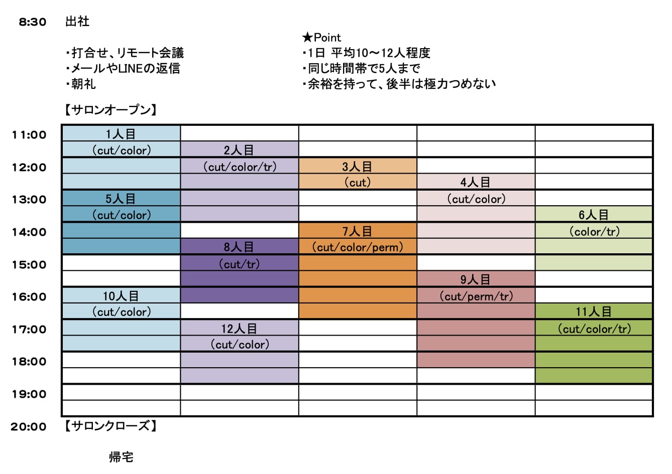 菅野さんの1日の流れ/平日は5枠で10〜12人。滞在時間で人数をチェックして混み合わないよう調整