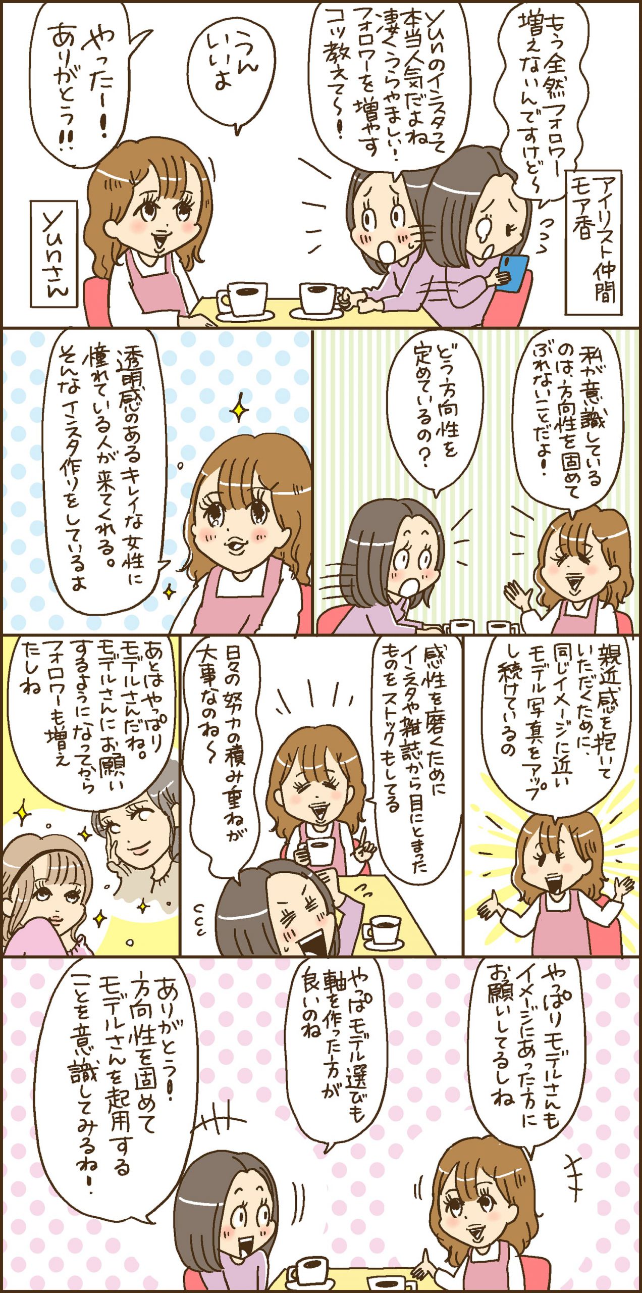 yunさんは方向性を「『透明感のある』キレイな女性に憧れている人が来てくれる」に固めて、インスタの更新を続けているんですね。その方々に親近感を抱いていただくために、近い年齢層のモデル写真をアップしているとのことです。雑誌やインスタで目に留まった写真からインスピレーションを受け、感性を磨く努力を継続しているそうです。