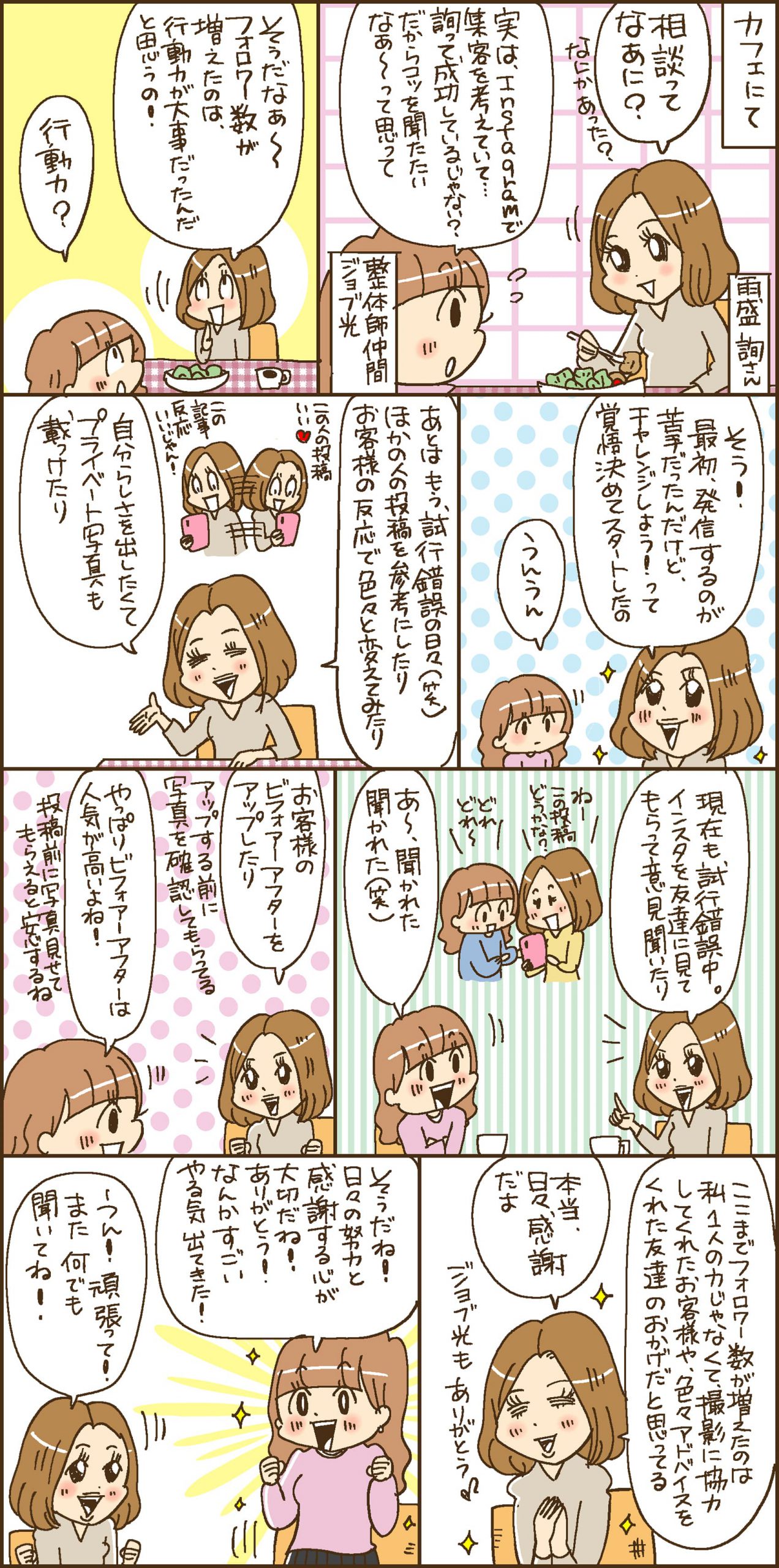 雨盛さんよると、SNS集客を成功するためには行動する、他の方の投稿を参考にし、自分らしさを出していくような試行錯誤を重ねることも大事とのこと。試行錯誤ではフォロワーの反響以外にも、友達から投稿への意見を聞くようにしているんですね。投稿する前にお客様にご本人のお写真を見せるような誠実な対応もフォロワーアップには欠かせないポイントとのことです。