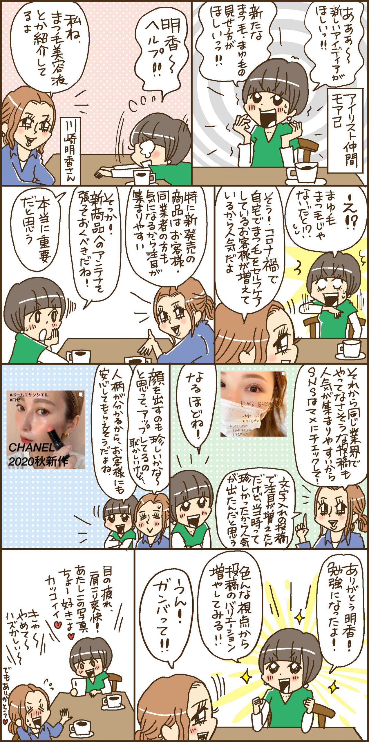 まつ毛&まゆ毛投稿のバリエーションに限界を感じ、フォロワー数も伸び悩み中のアイリスト仲間・モア巳。一枚上手の川崎さんは、時代を読んで閲覧者に求められている投稿を、繰り返しました。