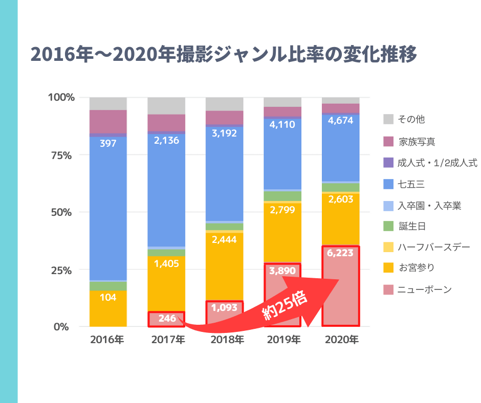 特に注目すべきはニューボーンフォトやハーフバースデーなど、従来撮影されていたハレの日だけでなく、プロカメラマンをカジュアルに使う方が増えているということです。