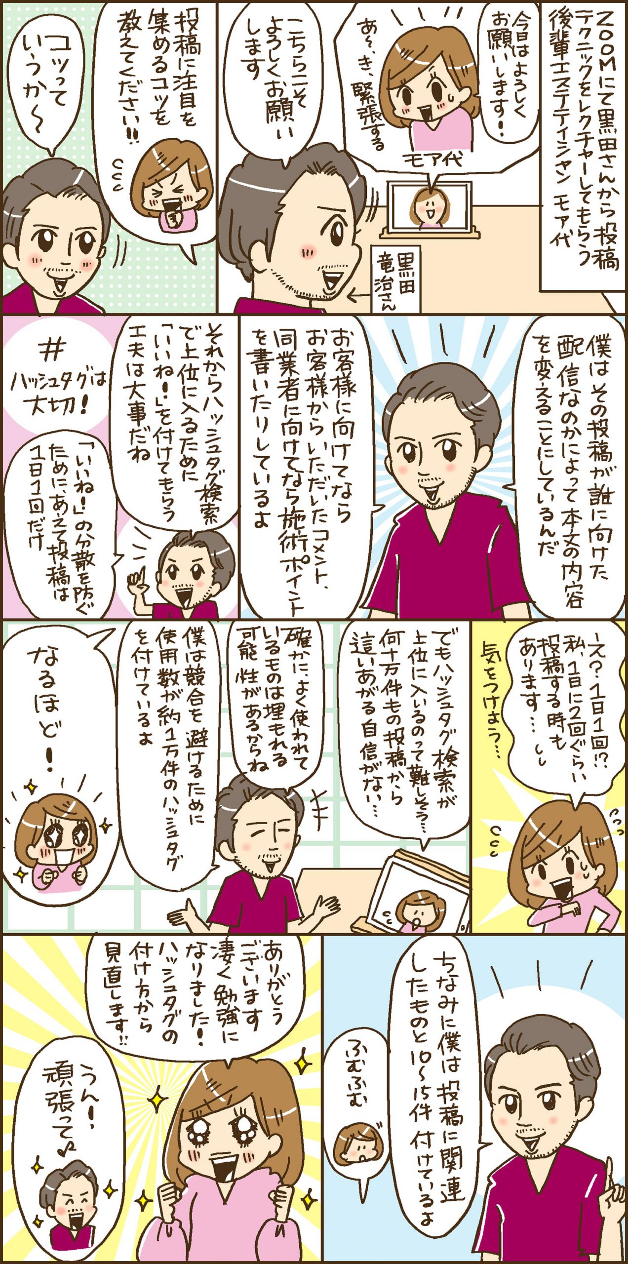 投稿になかなか注目が集まらない後輩エステティシャン・モア代の悩みを黒田さんが解消! 1日の投稿件数を抑え、使用数1万件ほどのハッシュタグを使うことが注目度アップのポイントのようですが…。