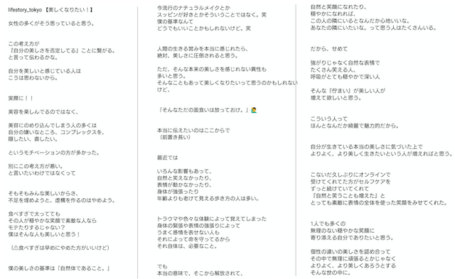 自身を整命師と名乗る広瀬裕六さんの理論や施術スタイルは、世の中に広く認識されている「当たり前の価値観」を覆します。そんな裕六さんの施術スタイルは、発信方法を一歩間違うと誤解を生みかねませんが、あえてInstagramを選び、「文章」で勝負することに。何度もスクロールしなければ読み終わらないほどの「長文スタイル」にこだわり、「健康とは?」「美しいとは?」「生きるとは?」などについて熱く語っています。