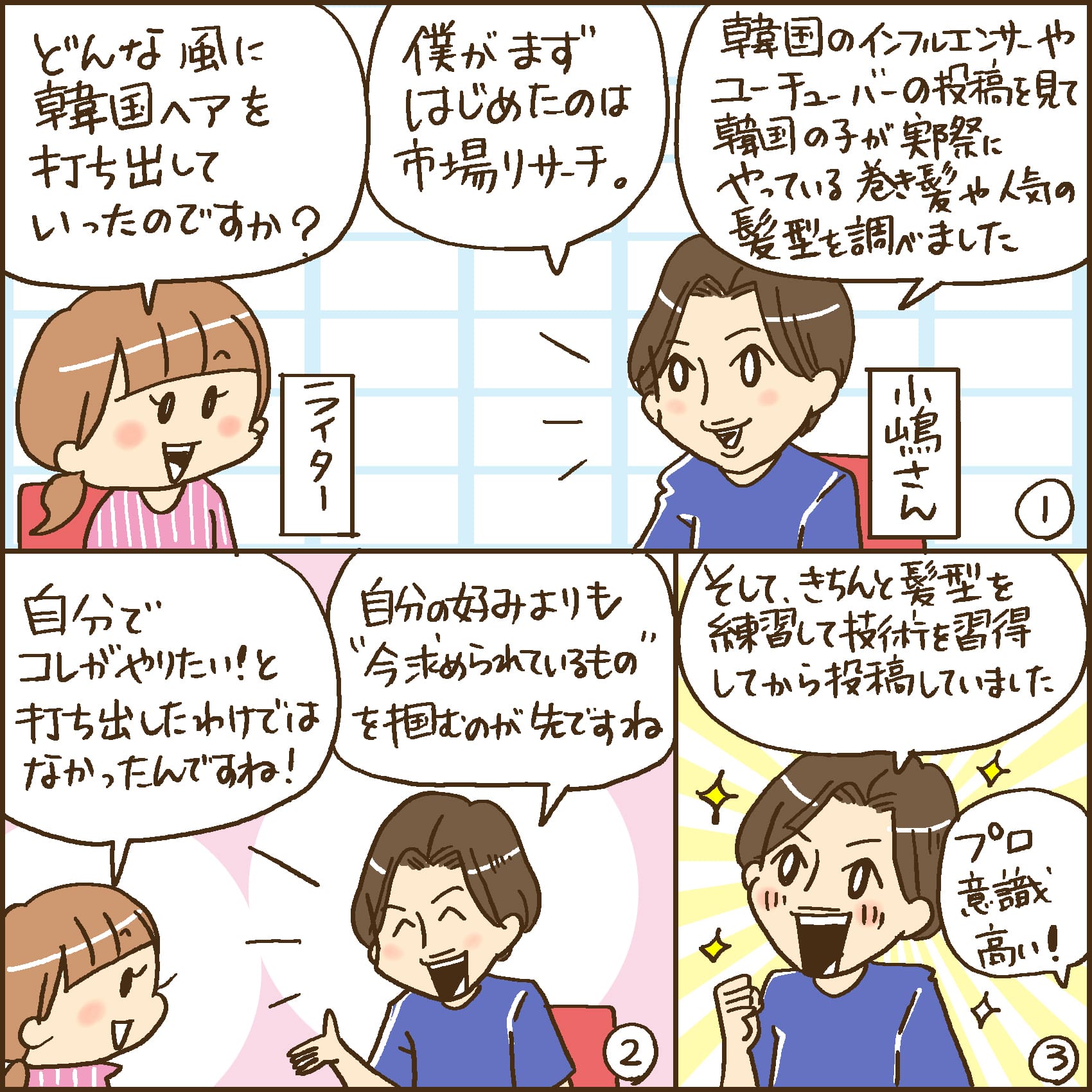 前編では、「韓国ヘア」を成功例に、小嶋さんがどのようにスタイルを打ち出してきたのか、また専門性をPRするための投稿テクニックを教えていただきます。