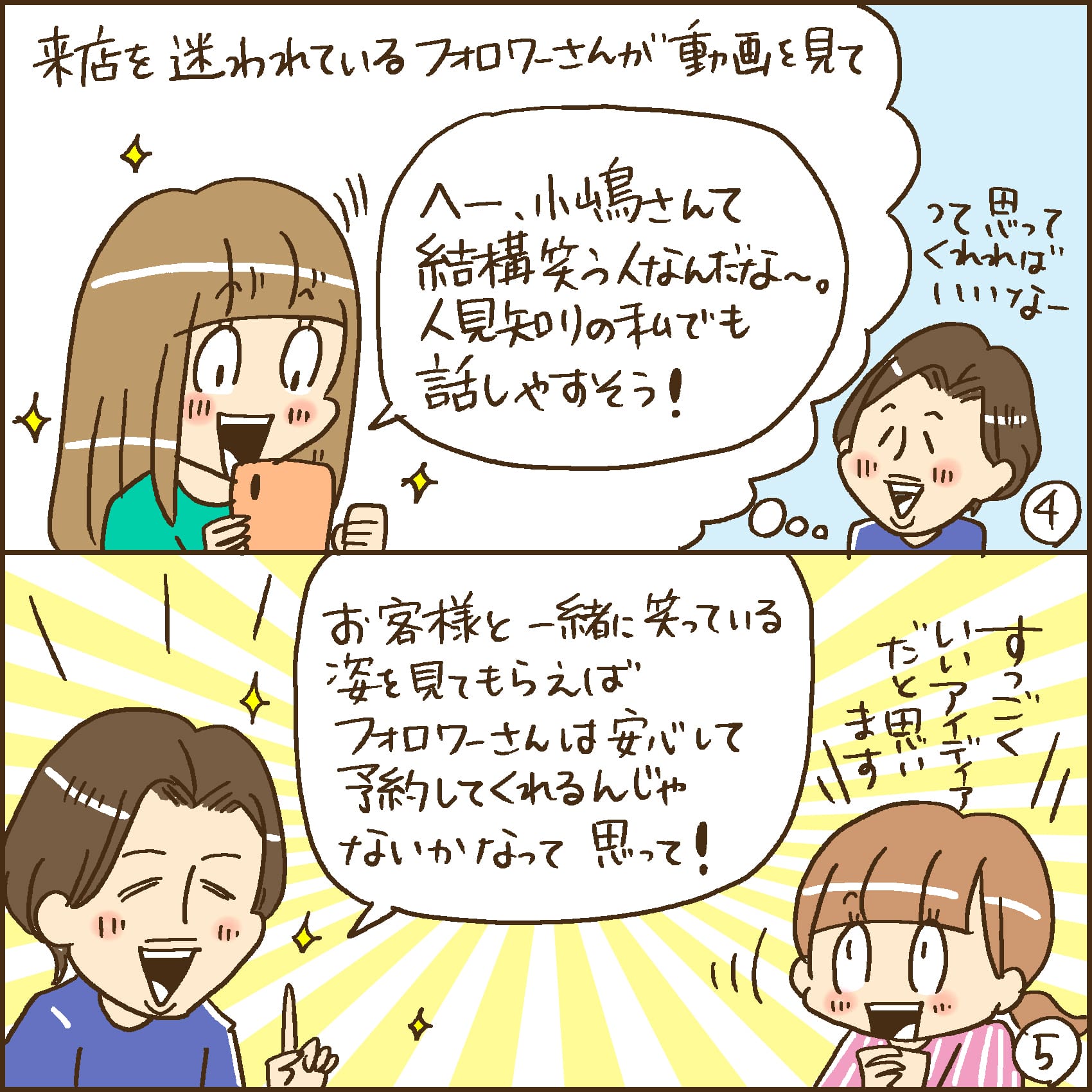 サロンワークが忙しくなったために今はやっていないのですが、お見送り時にお客様と2ショットを撮ってストーリーに上げていました。「ヘアスタイルは好きだけど、サロンに行こうか迷っている」というお客様への最後のアプローチとして、お客様との距離の近さを少しでも伝えられたら良いなと思って。