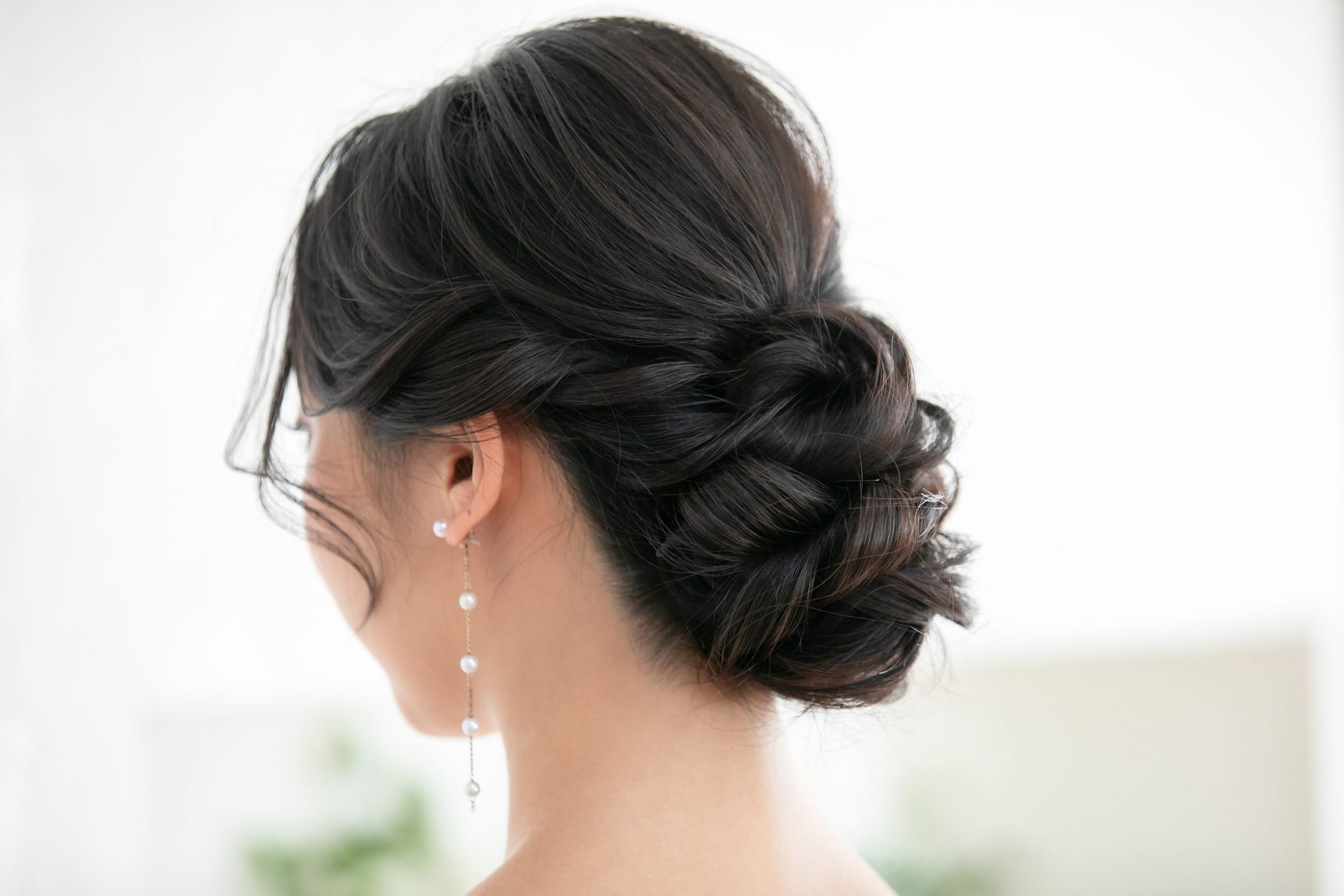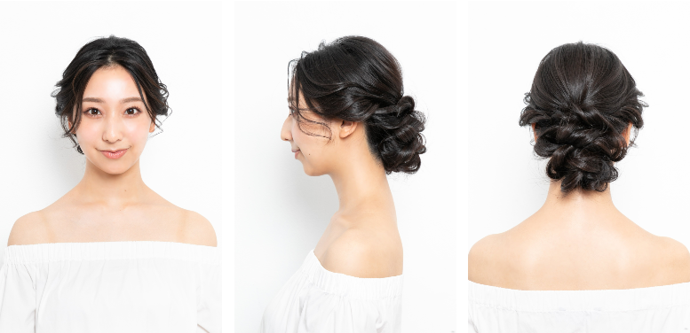 サイドのリバースの動きと、シニヨンの重なりが華やか。動きはあるのにシルエットがまとまって見えるから、清潔感&上品さも感じられます。