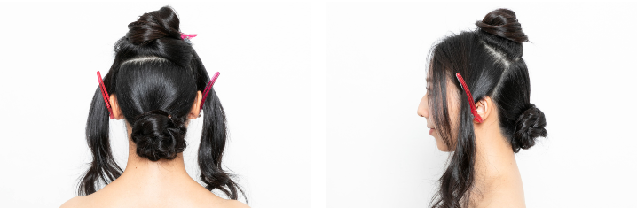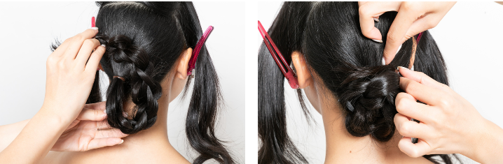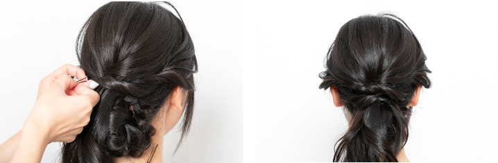 根元のゴムに巻きつけるように、ネープギリギリにお団子を作る。土台と毛束が浮かないように、巻きつけながら根元に向かってピンで留めていく。ピンで土台と毛束を縫うイメージで。