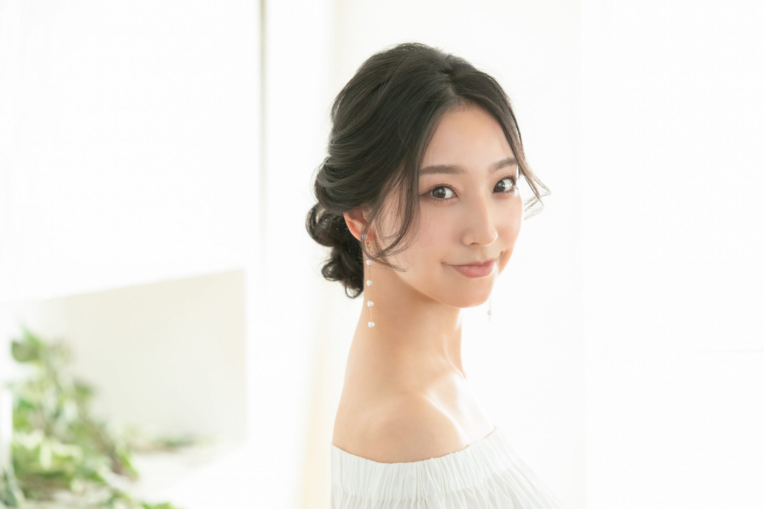 髪のツヤは花嫁さんを華やか&幸せに見せてくれる一番のアクセサリー。ツヤ感が出るスタイリング剤を使いつつ、髪を扱う時は指の腹ではなく指先を使うこと。