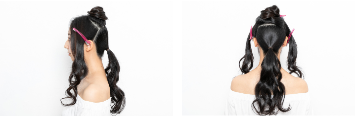 サイドの毛束をねじって、5で作ったトップの上に重ねてピンで固定。逆サイドも同様に。