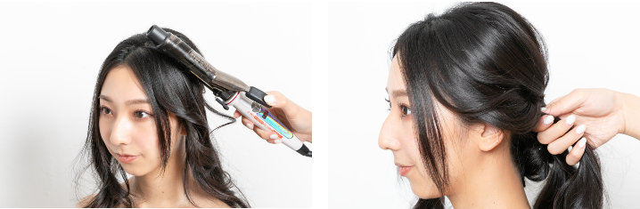 今回は32mmのヘアアイロンを使用。顔周りからリバース、フォワードの順に後頭部に向かって全体をMIX巻きに。中間から入れて毛先まで巻き込む。
