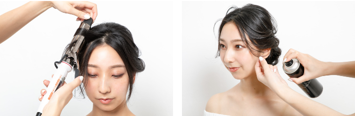 バランスを見ながら崩して形を整え、スプレーでセット。シルエットにつながりが生まれるように均一な丸みを作り、凹凸ができないように意識して。