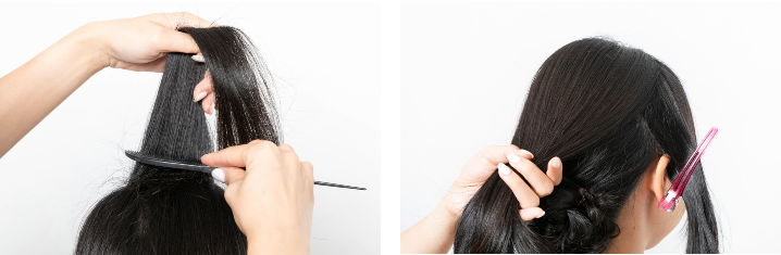 太さが出るようにランダムに毛束を引き出す。シニヨンにするので全部引き出さなくてOK。