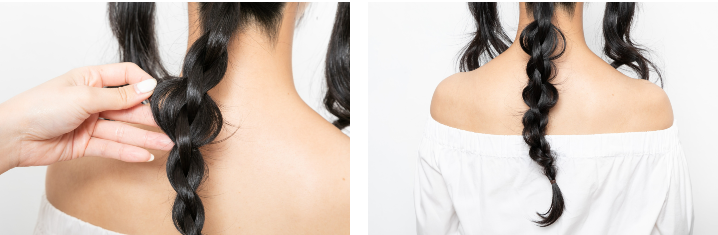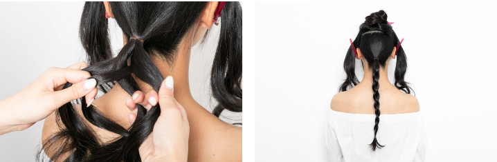 バックの毛束を4本に分け、毛先まで4つ編みにしてゴムで結ぶ。ゴムはきつく結びすぎない。