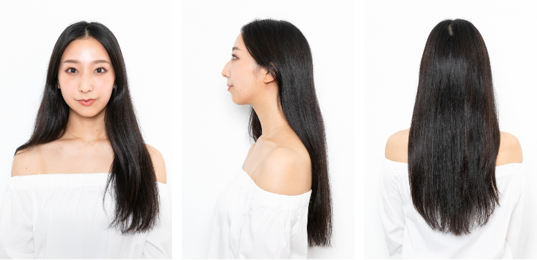 髪の毛が作るフレーム効果で、顔型はいくらでも変えて見せられます。顎先を含めた髪のシルエットをキレイな菱形に見せてあげると、小顔&リフトアップが狙えて仕上がりもキレイに見えるように。