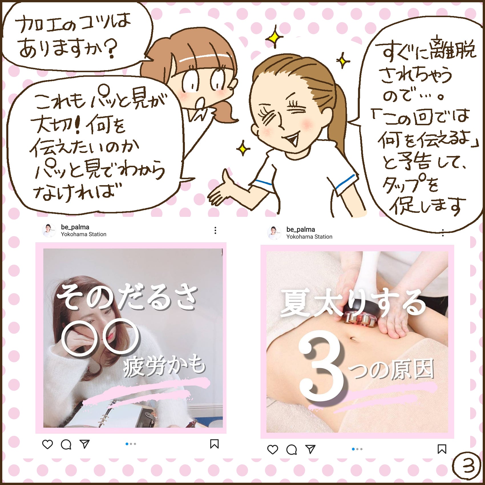 サロンワーク中のお客様のリアルな声をもとに考えています。多くのお客様が悩んでいることや季節あるあるのネタなど、お客様の「困ったな…」に向けて発信するようにしています。