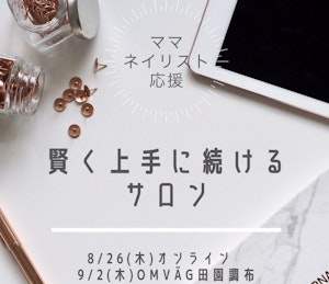 パートナーネイリストとして所属しているOMVÄG田園調布店で、「ママネイリスト応援 賢く上手に続けるサロン」というセミナーを開催しています。テーマは、「ママがネイリストの仕事をどうやって続けていけば幸せでいられるか」。女性はライフステージによって環境が変わっていくので、ネイリストを長く続けることってけっこう難しいんですね。ライフステージが変化しても辛くならずに、ネイリストを続けるためのアドバイスをさせていただいています。