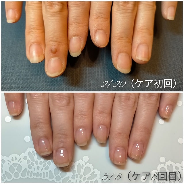 わたし自身、このケアで爪の剥離が解消され、小指の爪のピンクの部分も広がってきれいな爪になりました。爪が生え変わるまでには通常半年かかるのですが、「最強ネイルケアメソッド」ではその倍のスピードの3ヶ月を目指します。爪がフヤフヤの時期が短くなり、ストレスも半減します。
