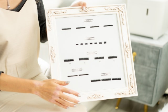 これもカウンセリングの一部ではあるのですが、マツエクは完成時のイメージがわきづらいと思うので、最初に目元の形を共有させていただいて、その写真をお客さまと見ながら、目の形や施術についてご説明します。たとえばひと言で二重といっても、少しスクエアとか、丸みをおびているとか、二重の幅などでまったく違うので、提案も千差万別になるんです。ほかにも目の形とまつげの長さのバランスには、黄金比率があります。目元の長さをはかることで、黄金比に近づけるような提案をしていますね。