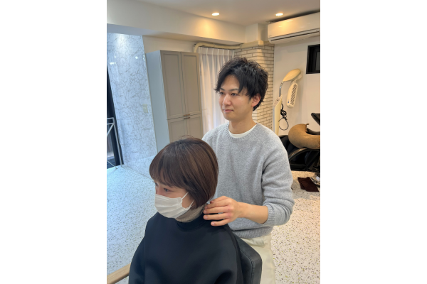 まずカウンセリングですが、一枠に予約はふたりまでにして、1人ひとりにかける時間を多くとってきました。お客さまの要望、悩みをちゃんと聞きながらも、もっと素敵になるような提案を心がけています。たとえばお客さまから長さは切りたくないけれど、ボリュームを抑えたいという希望があれば、一歩踏み込んでもう少し短くするとボリュームが半分くらいになりますよ、と伝えることもあります。説明力、提案力は顧客満足度に直結すると思うので、大切にしていることのひとつです。カウンセリング、ヒアリングは前のサロンのときにたたき込まれきたので、その技術があがったのかなと思います。