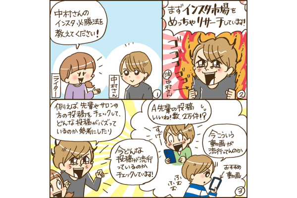 Instagramで先輩や他のサロンの人がどんな投稿をしてバズっているのか、今どんな投稿が流行っているのかを自分で探すんです。そして、とにかく真似をする。