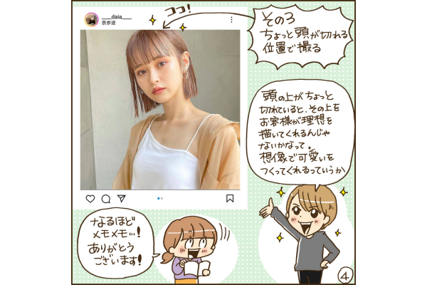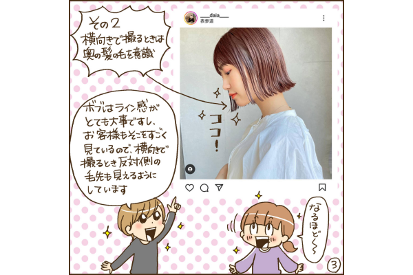 あと、集客に直接影響していることではないのですが、スタイリストのもとに来店したお客様が僕のボブの投稿を持ってきてくださる方がいるのがすごく嬉しいですね。アシスタントのうちは限られた時間でしかお客様を呼ぶことができないので、どうしても予約枠が足りず、もどかしい思いをすることもあるのですが、スタイリストに僕の投稿を見せてくださっている光景を見かけると、自分の発信がきちんと届いているんだなと嬉しくなります。