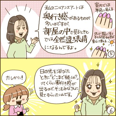 雰囲気を重視しすぎると、かえってネイルに注目してもらえないので注意が必要です。あと、ニュアンスアートは自然光を味方につけるとより素敵に魅せることができるんです。