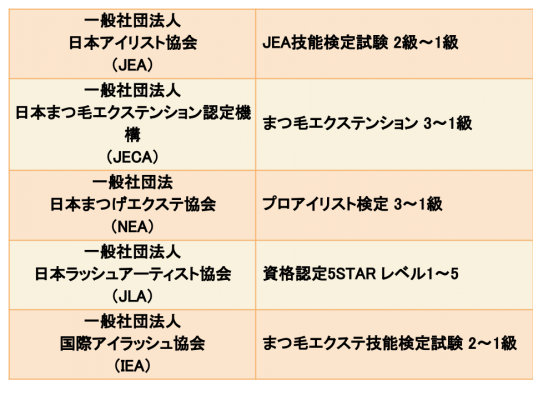 アイラッシュスクールは、スクールが加盟している協会によって取得できる資格も変わります。アイラッシュスクールで取得できる資格には下記のような資格があります。