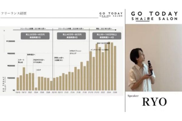 予約が埋まる美容師として人気を得ながらGO TODAY SHAiRE SALONの事業も担当する松岡諒さん。前編では、多岐にわたる仕事の内容や、それによってかなえたい松岡さんの志を伺いました。後編では美容師歴4カ月で技術も売上もゼロからのスタートだった松岡さんがさまざまな経験を積み、それを発信することで現在のポジションにいきついたお話を詳しく伺います。