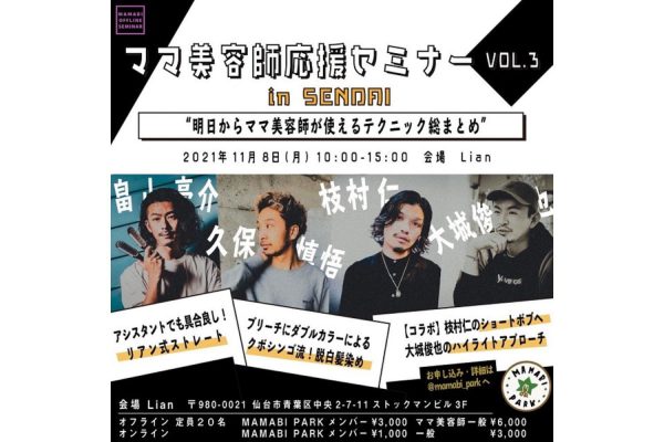 最近では名古屋でセミナーを開催しました。講師初チャレンジのMAMABI PARKのメンバーを含むコラボセミナーだったんですが、カット・白髪染めとママさんに向けたマインドの話をしてもらいました。