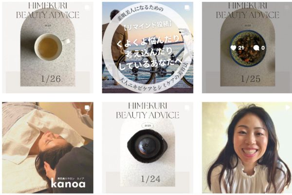 プライベートサロンなので施術者の人柄がわかったほうがいいとのアドバイスを起業塾で受け、オープン当初からインスタグラムとブログに力を入れています。オープンしてすぐの頃はインスタグラムとブログを連動させて1日3回は投稿していました。できるだけライブやストーリーなどの動画を使い、私の顔と人柄がわかるものを発信。思いついた企画はすぐに実践してみて、好評であれば続けています。