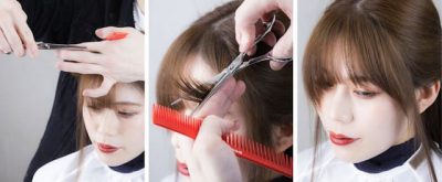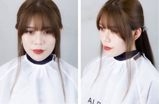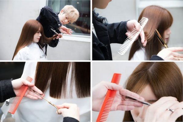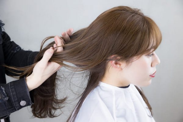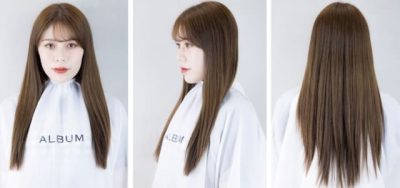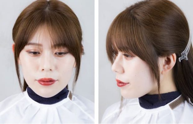 韓国風ヘアのカギとなる顔まわりのカットが完了した状態。前髪からおくれ毛までなめらかにつなげて、フェイスラインに沿わせることで小顔効果を狙える。