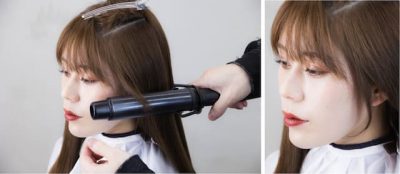 仮留めを外し、ハチ上の髪を外巻きにする。このとき眉の高さから動きがつくように巻くのがポイント。逆サイドも同様に巻く。