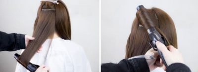 ハチ上の髪を分けとり、ヘアクリップで仮留めしておく。ハチ下は毛先を内巻きにワンカール。仮留めを外し、ハチ上は根元近くから外巻きにする。