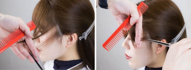 全体を10センチほどカットして毛先を整え、表面にレイヤーを入れる。スライドカットで質感調整して柔らかさをプラス。前髪は目の上ギリギリ程度に微調整。